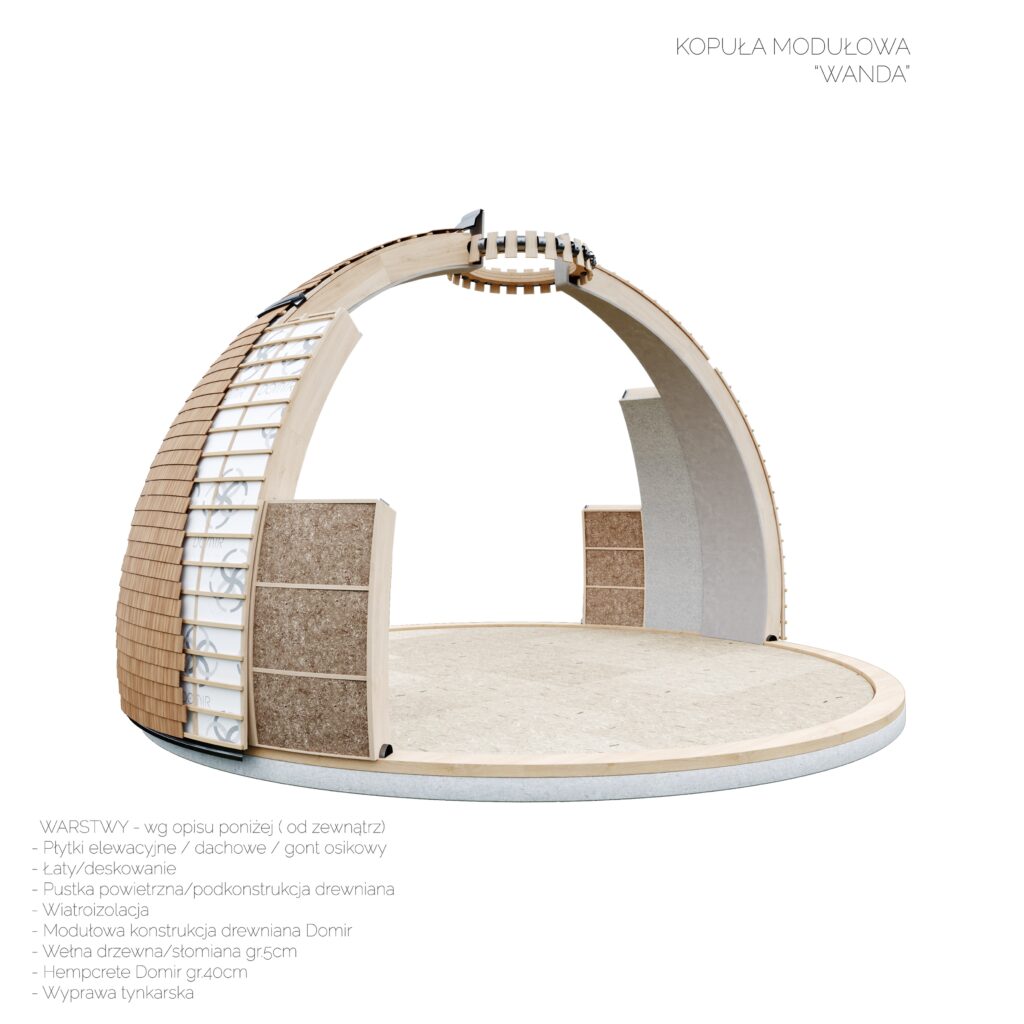 Jako tynk do wnętrza kopuły zalecamy tynk gliniany ze względu na liczne właściwości pro-zdrowotne gliny jak i dyfuzyjność współgrającą w z betonem konopnym. Takie ściany możemy malować naturalnymi dyfuzyjnymi farbami uzyskując dowolny kolor z palety barw. Innym proponowanym rozwiązaniem jest zastosowanie tynku wapiennego bądź deski drewnianej wewnętrznej.